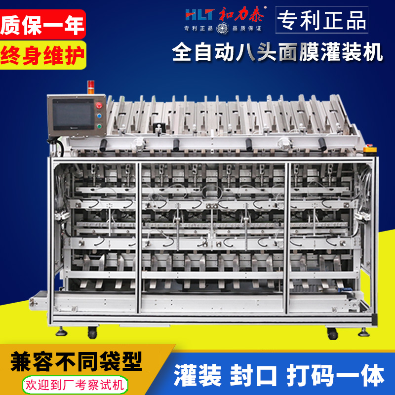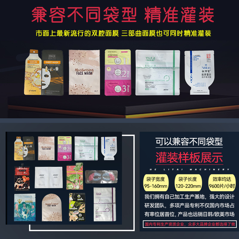 和力泰面膜灌裝機又分四頭面膜灌裝機、六頭面膜灌裝機、八頭面膜灌裝機、十頭面膜灌裝機、雙腔面膜灌裝機、三部曲面膜灌裝機、異型面膜袋灌裝機,高配定制面膜灌裝設備;